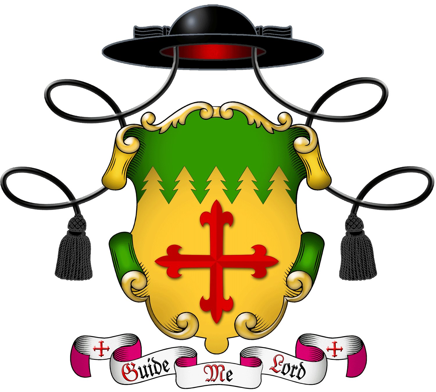 Below the shield on a decorative scroll we see the bishop’s chosen motto, “Lord Bid Me Come to You” from Gospel according to St. Matthew, chapter 14.