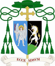 BLAZON: Azure, on three barrulets wavy Argent in base a ship under full sail Or, masted of the same; on the sail Argent the letter “M” Azure; in chief to dexter and sinister two escallop shells Or. Ensigned with an Episcopal cross Or placed palewise behind the shield and surmounted by a galero with cords and twelve tassels disposed in three rows on one, two and three all Vert. On a scroll below the shield the motto: “Lord Bid Me Come To You”.
