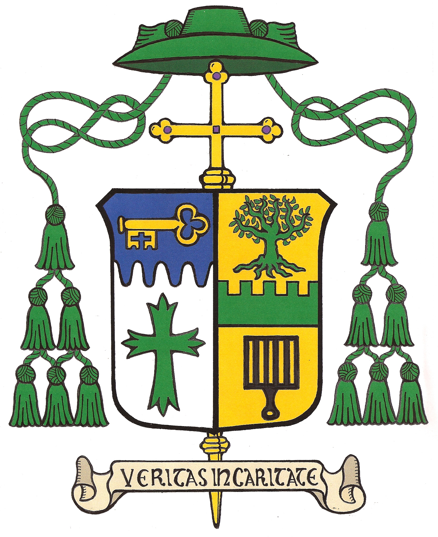 The external ornaments surrounding the shield indicate the rank of the armiger. In place of the martial helmet, mantling and crest ecclesiastics use a pilgrim’s hat called a “galero”. This broad-brimmed hat was, at one time in history, worn by all prelates. It exists now as a heraldic symbol. The Church has devised a system of various colors and numbers of tassels suspended from the hat to indicate various ranks of prelates. Since the original color worn by bishops was bright green this color has been retained in heraldry as the episcopal color. The galero therefore has twelve tassels suspended from cords and falling on either side of the shield. In addition a gold-colored episcopal cross is placed vertically behind the shield and extending above and below it. This cross, not to be confused with the processional cross used in the liturgy of the Church, is a heraldic symbol which has its origins in an actual cross, rather like a processional cross, which used to be carried immediately in front of any bishop whenever he was exercising his office. Throughout the Middle Ages such crosses were used in addition to the processional cross at the head of a liturgical procession. Eventually they fell into disuse but remain as a heraldic symbol of the office of bishop. These external ornaments conform with the Instruction of the Holy See, “Ut Sive Sollicite” of 1969 for the ornaments proper to a coat of arms for a prelate with the rank of bishop.