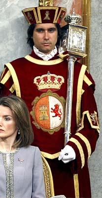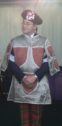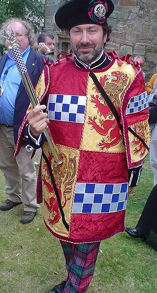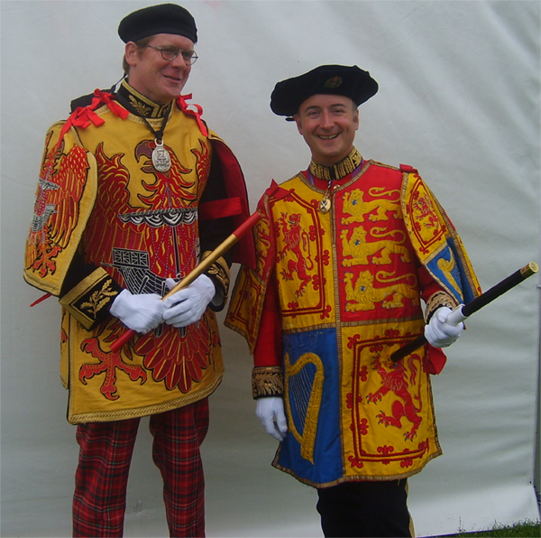 Here we see Finlaggen Pursuivant (one of the three private officers of arms maintained by the heads of different clans) Thomas Miers the officer of arms to the head of Clan Donald standing next to his predecessor, Adam Bruce, currently Unicorn Pursuivant to the Court of Lord Lyon wearing his tabard with the royal arms as used in Scotland where the quarter bearing the Scottish lion is repeated twice in the first and fourth quarters and the three lions of England take the secondary place.