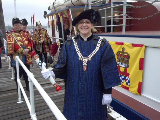 Pictured above is Claire Boudreau, the Chief Herald of Canada sporting the brand new tabard which depicts Canadian symbols on front and back and has the royal arms of the Queen of Canada on the sleeves. She also holds her ceremonial wand of office. This photo was taken during the river pageant for the Diamond Jubilee of Queen Elizabeth II.