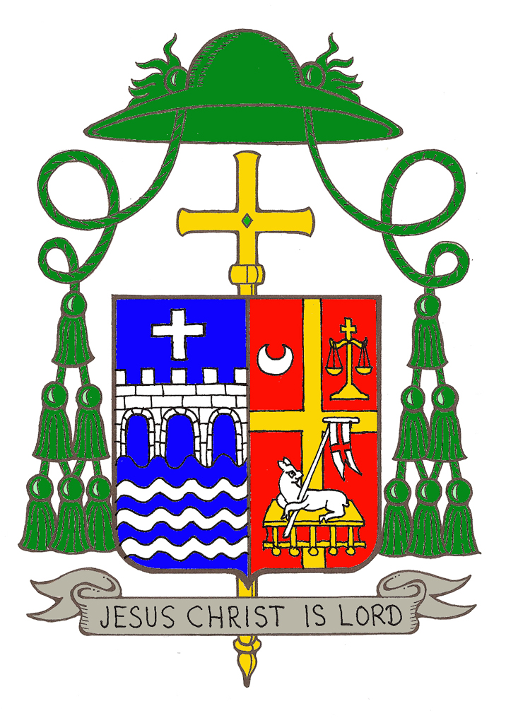 NOTE: It has been discovered that the scales of justice in this case are not a symbol of Canon Law but of St. Michael the Archangel, to whom the bishop has a great devotion.