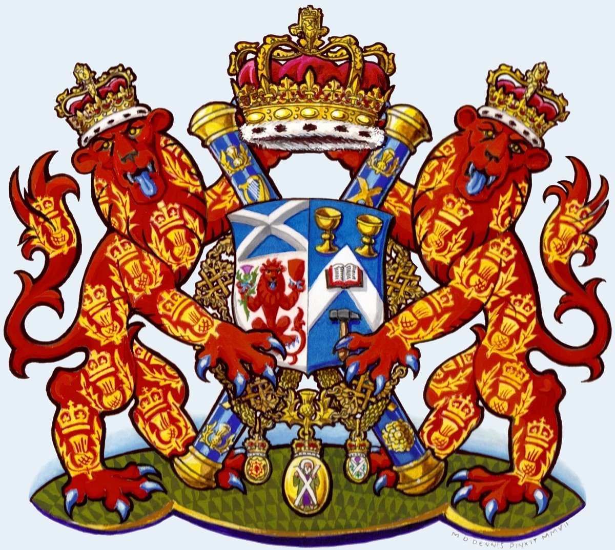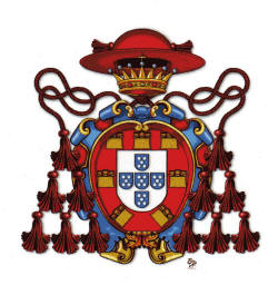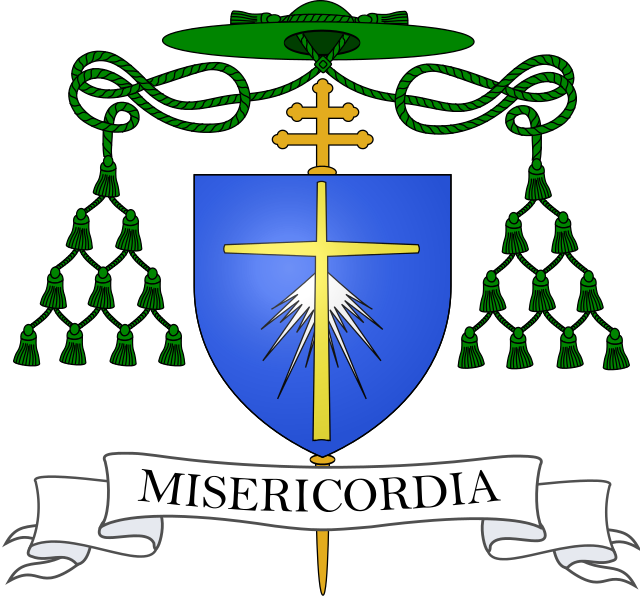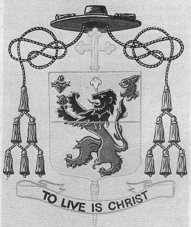 His coat of arms is based on the Irish arms associated with the name Daly. It has the addition of a scallop shell, a symbol of his baptismal patron, St. James, as well as the Sacred heart, a lily and a griffin’s head. These charges represent family allusions as well as his personal devotions. Unfortunately, I do not have a full color rendering.