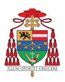 The arms also illustrate that the method of marshaling coats of arms preferred in many places, impalement, is far from the only option. The ancient arms of the See of Salzburg make up the upper third of the shield. The center section of blue with the gold grapevine is primarily emblematic of those referred to in Jn 15:1-5 the Lord’s vineyard and the strong connection between Christ and the believer (“I am the vine; you are the branches.”) . At the same time the vine but is also reference to the origin of Dr. Lackner from the wine area , namely that of Eastern Styria around Kapfenstein and St. Anna am Aigen. The golden heraldic lily is the actual symbol for Mary. The threefold division of the fleur-de-lis symbolizes the Holy Trinity of the Father, the Son and the Holy Spirit. The green base shows the “Franciscan Conformities” or the coat of arms of the Franciscan Order (without the clouds).