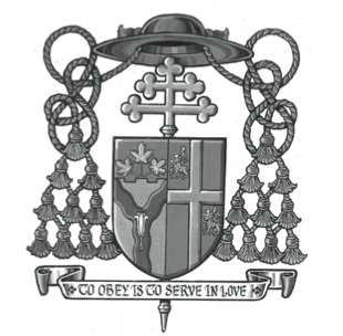 He may impale these arms with those of the archdiocese (below). In addition, the episcopal cross behind the shield will become an archiepiscopal cross with two horizontal bars and another row of green tassels will be added to the galero.