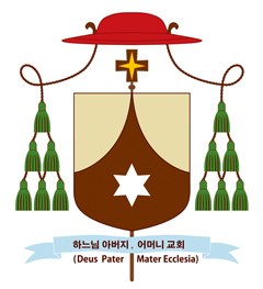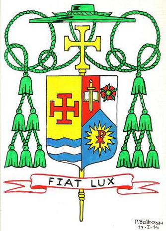 The arms naturally incorporate images found on the Miraculous Medal, which had been first entrusted to Catherine Labouré by the Blessed Virgin Mary. The shield incorporates four images found on the Medal, the Marian monogram, the stars from Sacred Scripture (as ascribed to Mary in the Apocalypse: 12-13), and the Sacred Heart of Jesus and the Immaculate Heart of Mary side by side. The shield is worked in blue and in gold. On this gold field is found the Marian cipher, a letter “M” surmounted by a Christian Cross, an image presented to Saint Catherine by the Virgin Mary herself. It is blue, as it represents the Blessed Mother specifically.