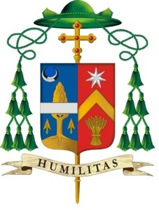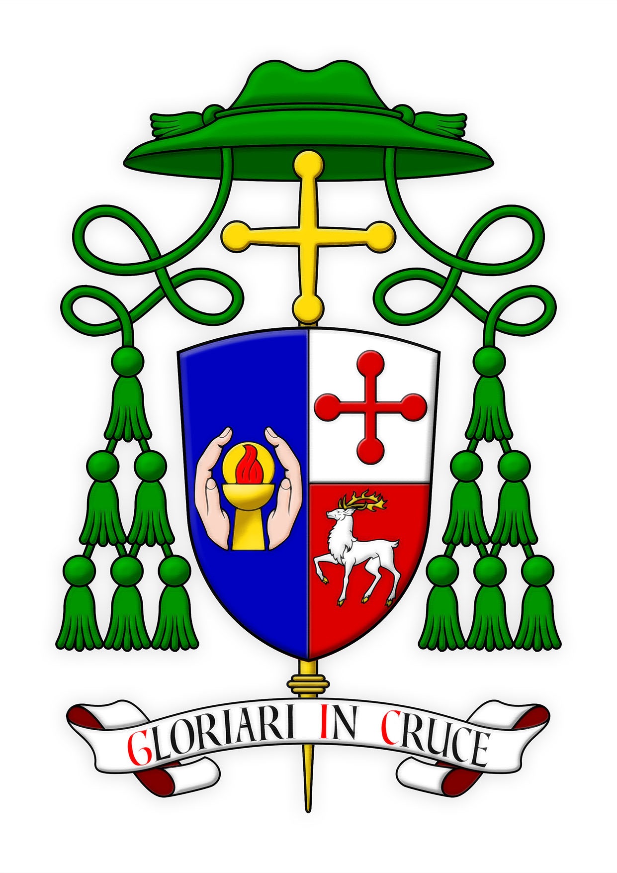 The galero, or ecclesiastical hat, is used in Church heraldry in place of the more martial helmet, mantling and crest. Originally a pilgrim’s hat it was worn and used in heraldry by Cardinals. Later, it was adopted by the lesser prelates. Eventually a system of both colors and number of tassels was devised to indicate the various ranks within the hierarchy. Msgr. Rowan’s arms use a black galero like any priest but the cords and tassels are purple indicating he is a member of the papal household. This galero indicates the bearer is a Chaplain to His Holiness according to the Motu Proprio, “Inter Multiplices” of Pope St. Pius X in 1905.