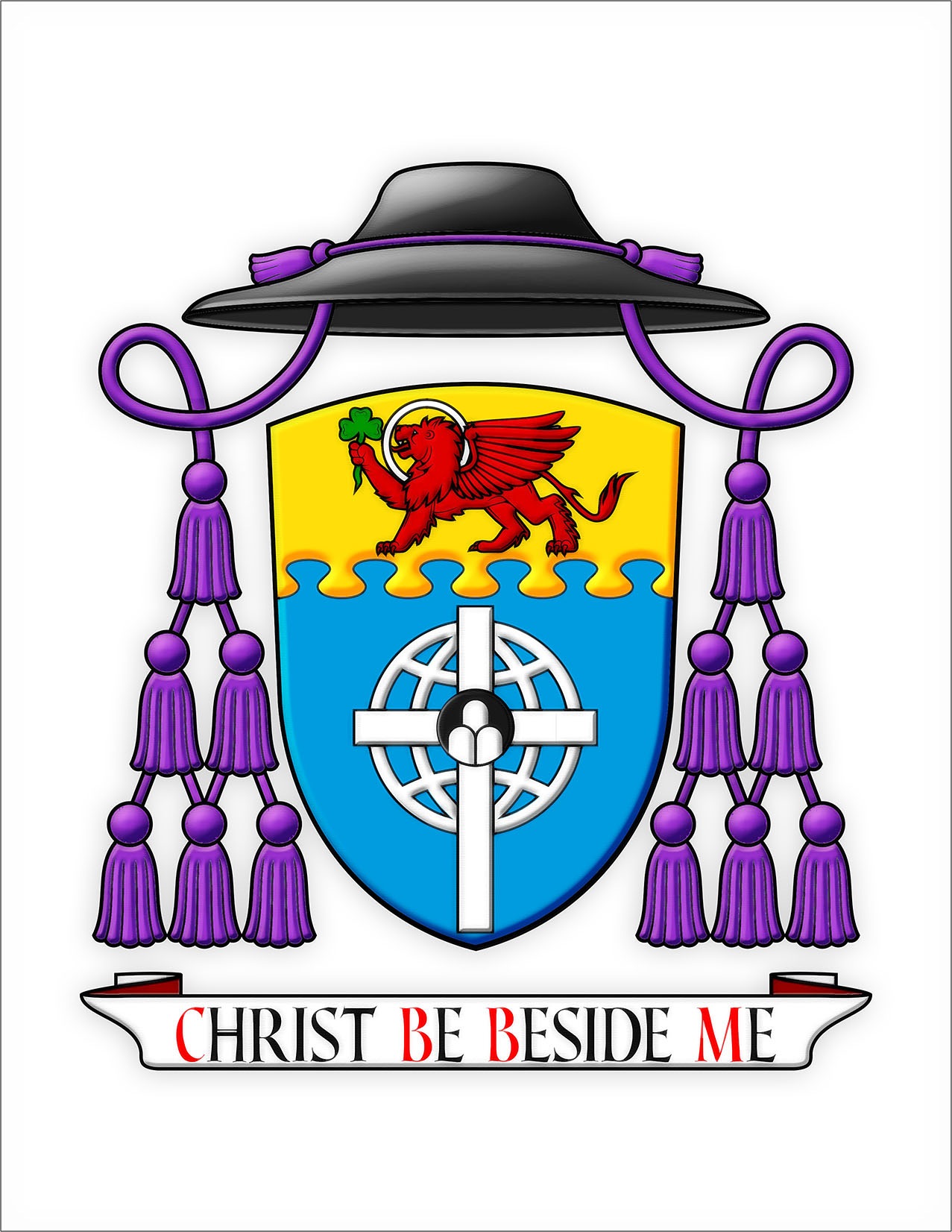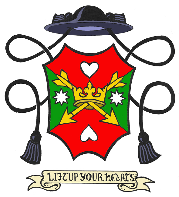 On a scroll below the shield Msgr. Rowan has chosen the motto, “Christ Be Beside Me” which is taken from the prayer known as “St. Patrick’s Breastplate”. After I completed this design and Msgr. Rowan approved the artwork was quickly and expertly executed by Mr. Sandy Turnbull of Australia. Mr. Turnbull is a member of the Australian Heraldry Society.