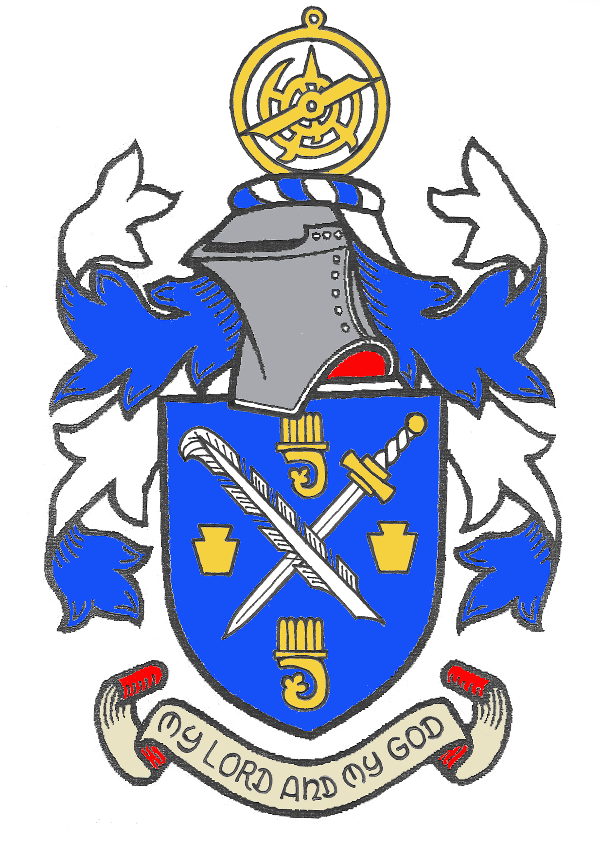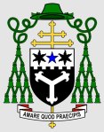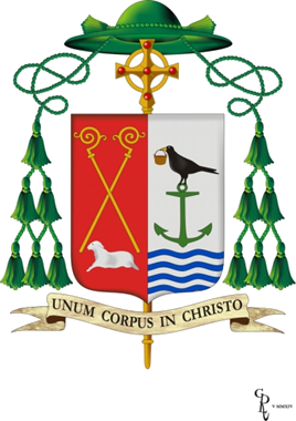 The personal arms of Bishop Kevin occupy the left side. This part of the shield is in silver (argent). The anchor, symbol of hope, is taken from the Doran family motto, Spes Ancora Vitae (Hope is the Anchor of Life). The anchor is in green (vert), the symbolic colour of hope.