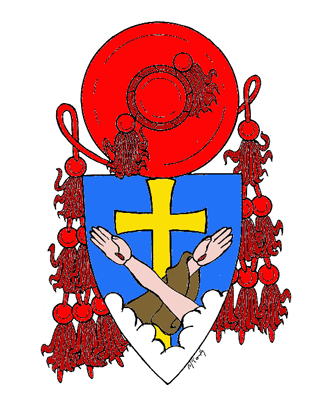 Saint Bonaventure, Cardinal-Bishop of Albano. As a Franciscan he bore simply the arms associated with the Order. He had also served as Minister General of the Order of Friars Minor. The artwork here is by the late Michael McCarthy of Australia.