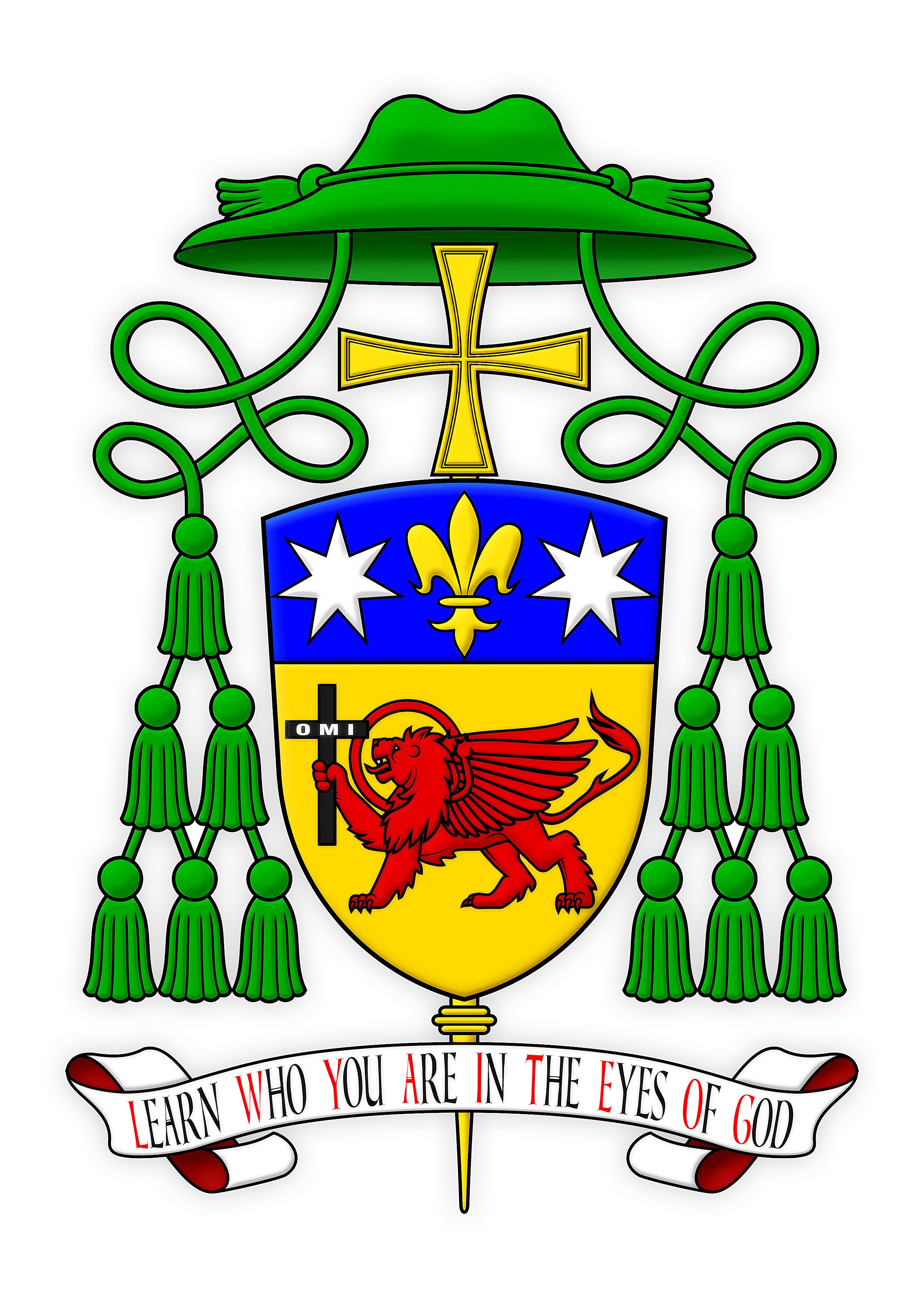 His newly assumed arms (above) reflect his baptismal patron, St. Mark, as well as the Oblates of Mary Immaculate, the Religious community to which he belongs. In addition, Our Lady and Australia are alluded to on the chief.