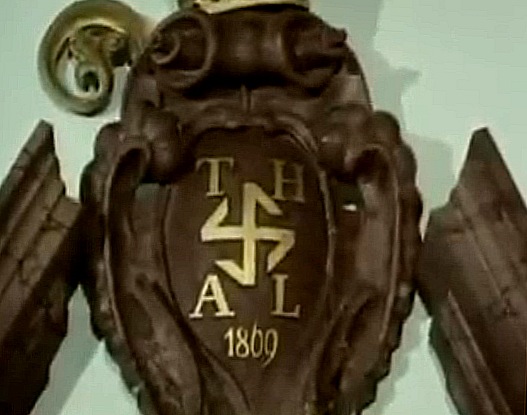 Born in Austria, a country that remained staunchly Catholic even after the Reformation, the young Hitler was educated at Lambach Abbey School run by Benedictine monks. Day after day the boy was surrounded by decorative motifs placed on doors and gateways throughout the abbey by one of its former (and deceased) abbots, Theodor Hagn. The device Hagn had used to decorate the abbey (below) contained his initials, T-H and the abbreviation A-L for Abbey Lambach surrounding an ancient form of the cross: a hooked cross. It was thought by many that this symbol stayed in the mind of the impressionable boy and he recalled it years later when choosing a symbol for the party in which he was rapidly rising to the top as its leader.