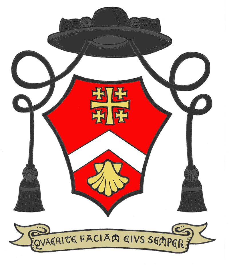 This coat of arms was designed for a man about to be ordained to the priesthood. He chose mostly red and gold to allude to the arms of Pope Benedict XVI who inspired him to pursue the priesthood. The Jerusalem cross is for his travels in the Holy Land and his care and concern for the Church in the Middle East. The escallop shell is from his family arms and also represents both baptism and pilgrimage. The chevron is a stylized carpenter’s square for St. Joseph, to whom there is a particular devotion, and is silver (white) to allude to Our Lady. The motto, from Psalm 104, says “Always Seek His Face”.