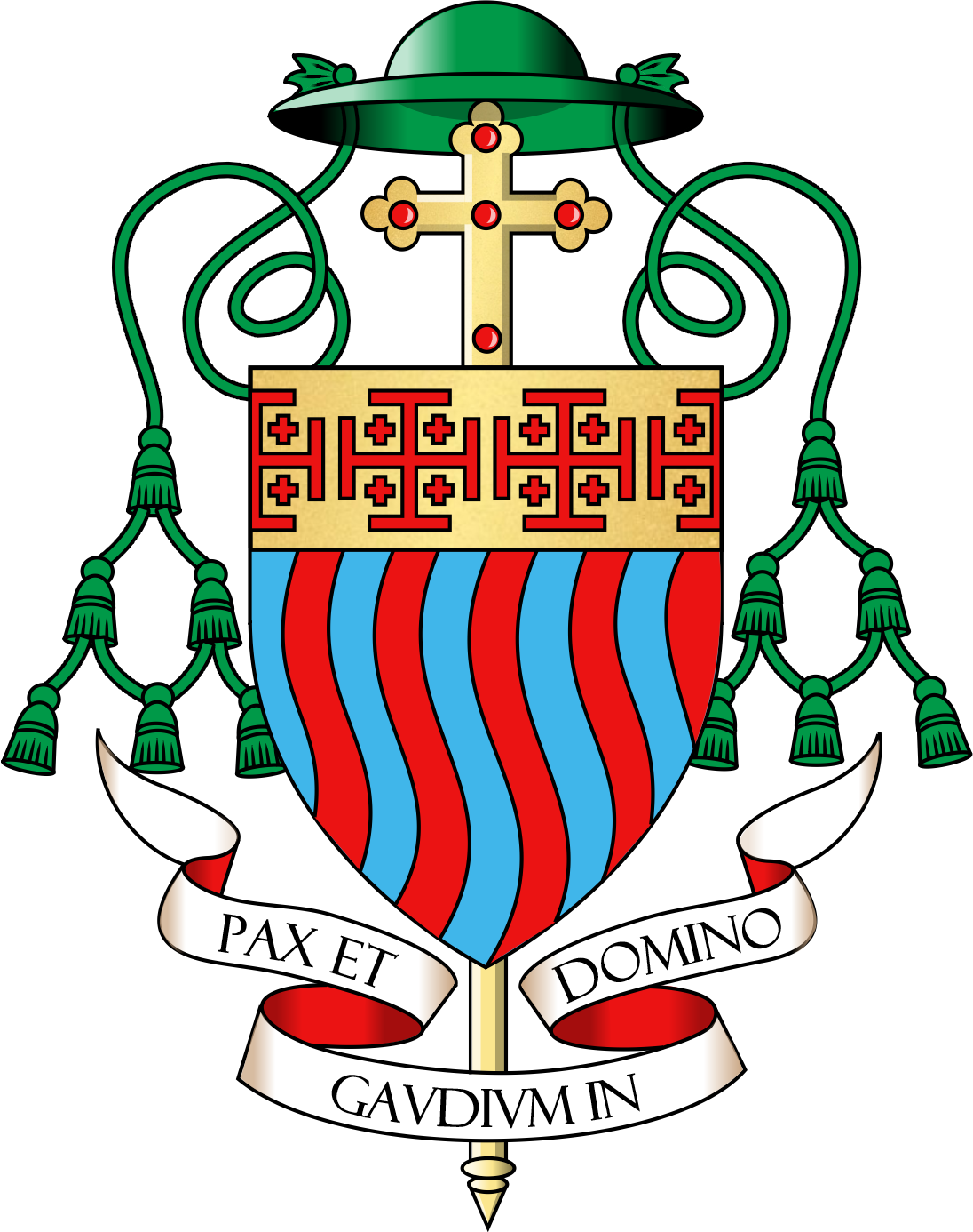 The wavy stripes hark back to Bishop Richard’s place of birth (the Zambian Arms consisting of similar stripes in black and silver), blue a reminder of Our Lady and the red a reminder of the English Martyrs. The Crosses of Jerusalem are a reference to Bishop Richard’s membership of the Equestrian Order of the Holy Sepulchre of Jerusalem.