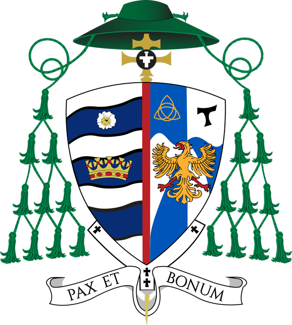 The explanation (from the archdiocesan website) is: “The personal Coat of Arms of Bishop Hartmayer is intended to symbolically represent the Bishop’s heritage and vocation as a Conventual Franciscan Friar. The background of wavy blue and white is a heraldic symbol for water. The Bishop is a native of Buffalo, NY – the Queen City of the Great Lakes. Water is also the key symbol of Baptism – the first Sacrament of Initiation as a Christian. This helps recall the Bishop’s ministry as the primary sacramental minister of his diocese. The eagle serves as a two-fold symbol of both the Bishop’s German heritage and of St. John the Evangelist. The Bishop’s father was named John and this is the Bishop’s middle name. The Celtic Knot, known as a Triquetra, represents the Bishop’s Irish heritage on his maternal side. And finally, the Tau is a reference to Bishop Hartmayer’s vocation as a Conventual Franciscan Friar. St. Francis would sign his writing with a Tau, often painted it on the walls and doors of places and he stayed, and would remind his friars that their habit was in the shape of a Tau cross illustrating to them that they must go into the world wearing this cross like an incarnation of Christ.“