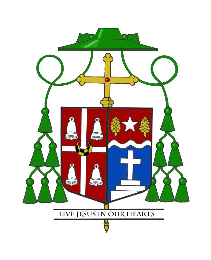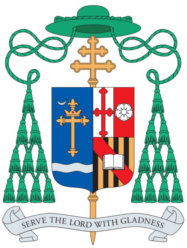 In base, on the alternating vertical bars of black and gold (yellow) with a red diagonal bar called a “bend,” is an open book of the Most Holy Scriptures. These charges, drawn from the arms of the Archdiocese of Baltimore, signify that His Excellency’s ministry as a deacon, priest, and now as an archbishop is to spread God’s Holy Word to the faithful of the Archdiocese. This symbolism joins well with the Archbishop’s motto, that is taken from the 100th Psalm, that in all that Archbishop Rozanski is to do for The Lord, he is called to “SERVE THE LORD WITH GLADNESS.”
