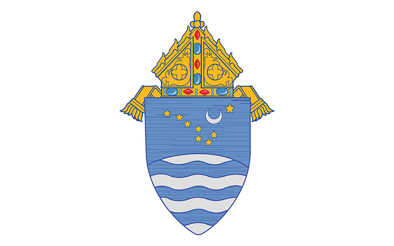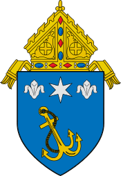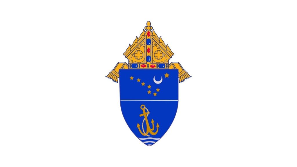 On September 17 the official merger of the Archdiocese of Anchorage, Alaska with the neighboring suffragan See of Juneau, Alaska will take place creating the Archdiocese of Anchorage Juneau. The current bishop of Juneau, the Most Rev. Andrew Bellisario, CM, will be installed at Our Lady of Guadalupe Co-Cathedral in Anchorage and also will be invested with the pallium as a Metropolitan Archbishop. The sensible decision to combine the coats of arms of the two dioceses by simply borrowing elements from each was made. The new coat of arms combines all that had been in chief of the arms of the Diocese of Juneau with what had been in base for the arms of the Archdiocese of Anchorage. It’s a lot of blue as each one had a primarily blue field but the overall look is not unpleasant.
