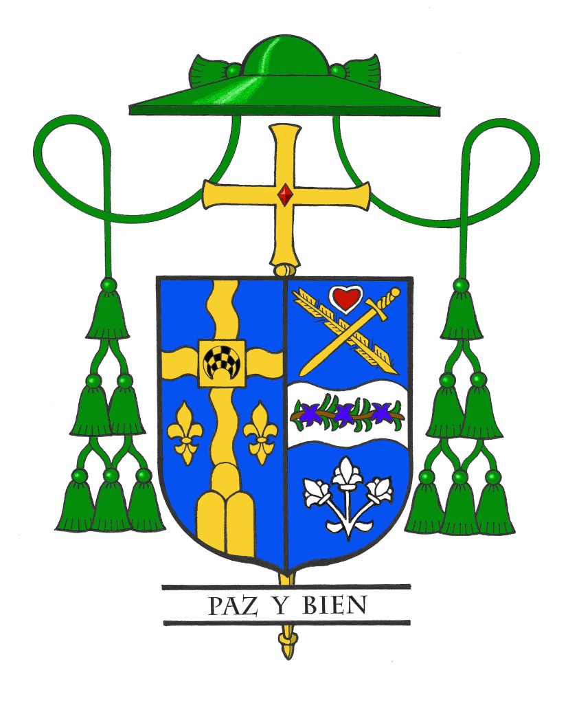Above the shield is the ecclesiastical hat, called a galero which, in heraldry, replaces the martial helmet, mantling and crest. “The hat with six pendant tassels (green, purple or black) on each side is universally considered in heraldry as the sign of prelacy. It, therefore, pertains to all who are actually prelates.” (Heim, Bruno B., Heraldry in the Catholic Church 1978, page 114) The galero is green with green cords pendant from it and twelve green tassels arranged in a pyramid shape on either side of the shield. At one time in history bishops and archbishops wore green before adopting the more Roman purple we see today. In heraldry the green hat and tassels was retained for prelates with the rank of bishop according to the Instruction of the Secretariat of State, “Ut Sive” of March, 1969.