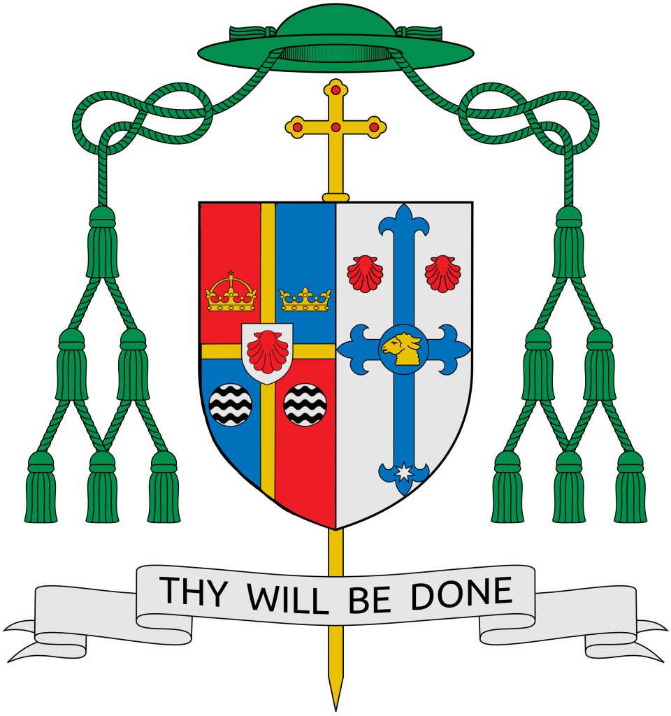 Above the shield is the ecclesiastical hat, called a galero which, in heraldry, replaces the martial helmet, mantling and crest. “The hat with six pendant tassels (green, purple or black) on each side is universally considered in heraldry as the sign of prelacy. It, therefore, pertains to all who are actually prelates.” (Heim, Bruno B., Heraldry in the Catholic Church 1978, page 114) The galero is green with green cords pendant from it and twelve green tassels arranged in a pyramid shape on either side of the shield. At one time in history bishops and archbishops wore green before adopting the more Roman purple we see today. In heraldry the green hat and tassels was retained for prelates with the rank of bishop according to the Instruction of the Secretariat of State, “Ut Sive” of March, 1969.