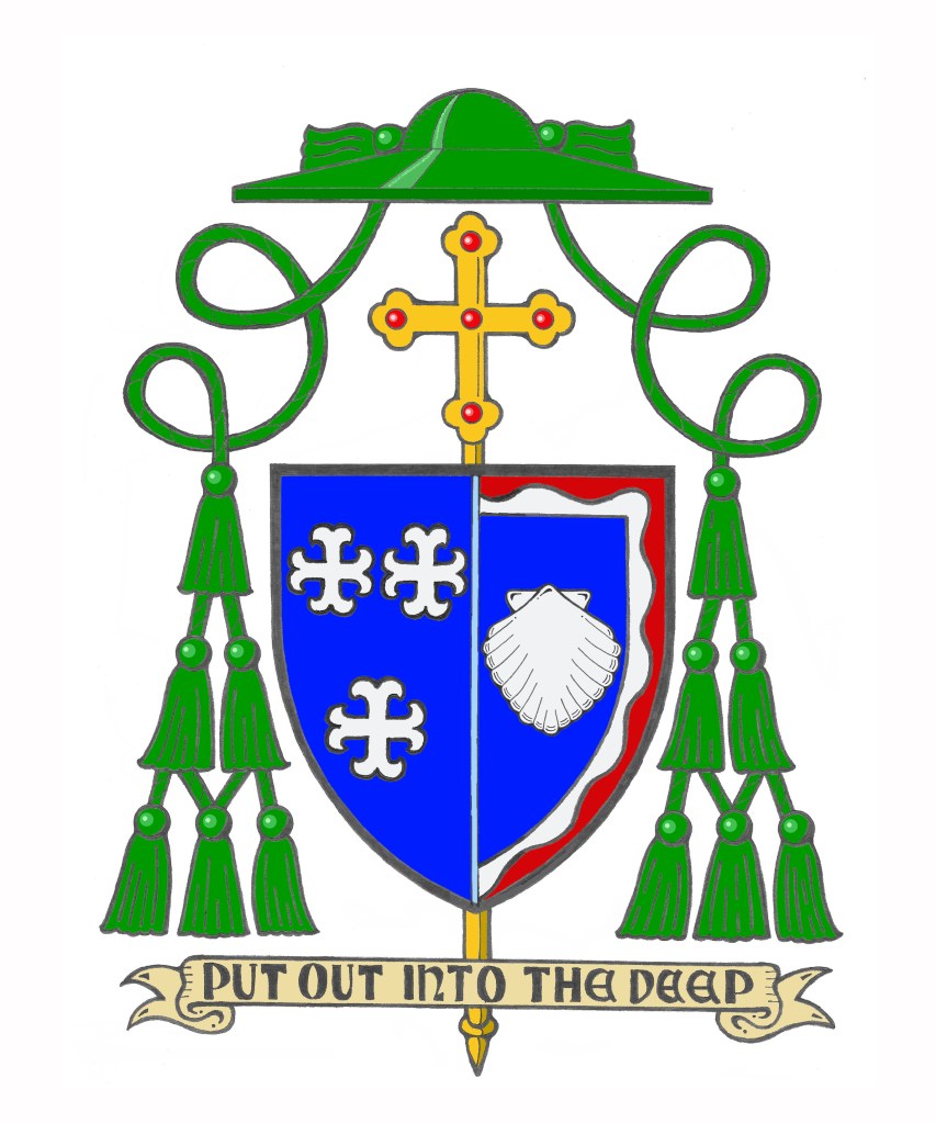 Both the blue background and the single escallop shell allude to the sea as evoking the Bishop’s own background and the shell is also borrowed from the coat of arms of the See of Rockville Centre, the diocese in which he was born and raised and which he served as a priest and auxiliary bishop. The shell image also recalls the Bishop’s heritage in the Diocese of Brooklyn, dedicated to its patron, St. James. The episcopal ordination of Bishop Henning took place on the eve of the Feast of St. James. In concert with the Bishop’s motto, the shell is a traditional symbol of baptism and pilgrimage. It is in the depths of these waters that Christians find their salvation in Jesus Christ.