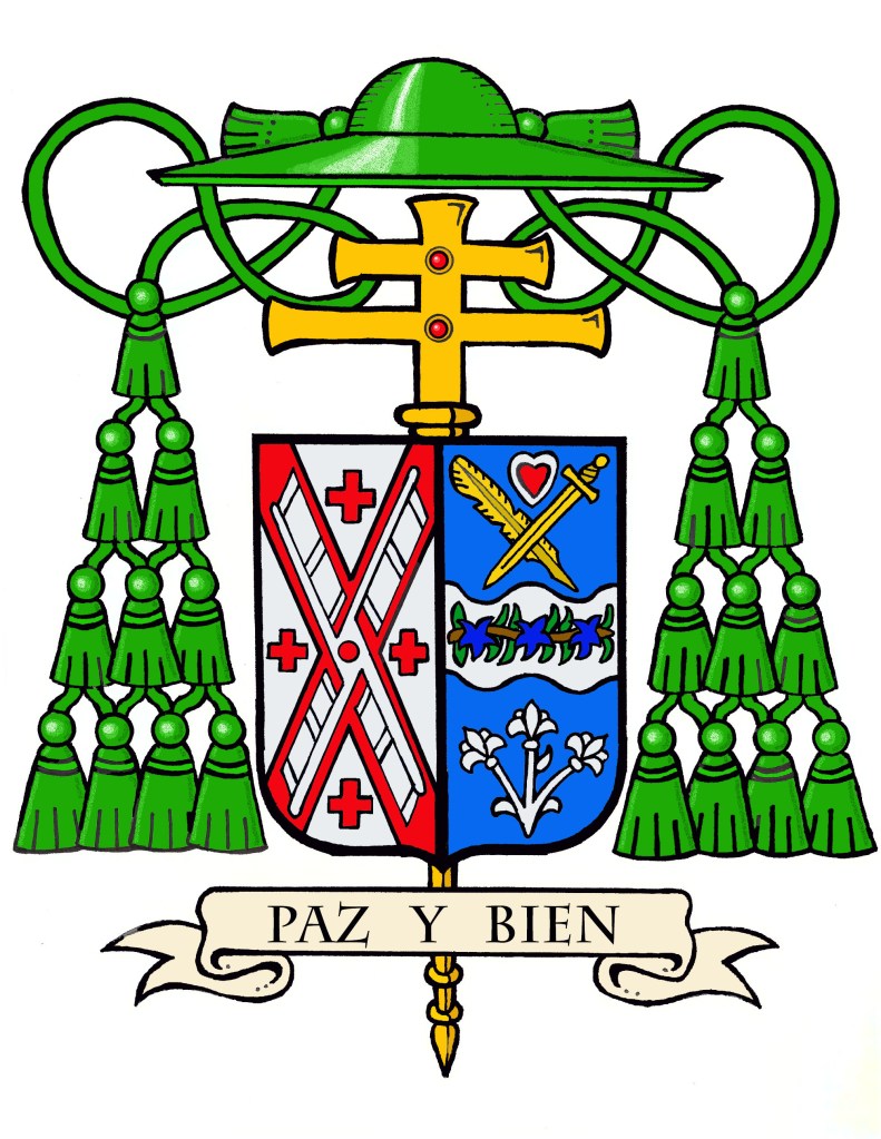 BLAZON: Arms impaled, in the dexter: Argent, on a saltire between four Greek crosses all Gules, the sails of a windmill arranged in saltire Argent. (Archdiocese of New York); in the sinister: Azure, on a fess wavy Argent a sprig of rosemary Proper; in chief a sword and a quill in saltire Or below a heart Gules fimbriated Argent; in base a sprig of lily of three blossoms Argent. (Archbishop Hicks). The achievement is ensigned with an archiepiscopal cross Or behind the shield and an archbishop’s galero Vert cords and twenty tassels disposed in four rows of one, two, three and four all Vert. On a scroll below the shield the motto: “ Paz Y Bien”.