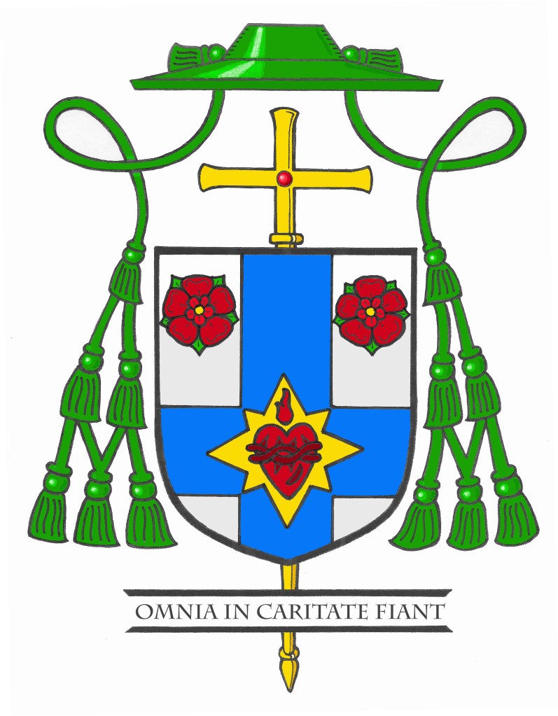 BLAZON: Argent, on a Latin cross reversed throughout Azure between two roses Gules barbed Vert and seeded Or, the Star of the Sea (Stella Maris) at the center point Or, charged with the image of the Sacred Heart of Jesus Gules (Bui). Shield ensigned with an episcopal cross Or behind the shield and a bishop’s galero Vert cords and twelve tassels disposed in three rows of one, two and three all Vert. On a scroll below the shield the motto: “Omnia in Caritate Fiant”.