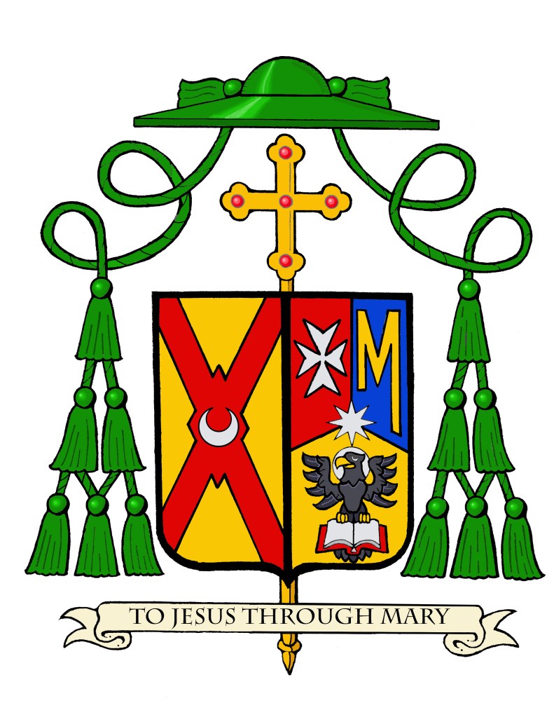 The motto below the shield is, “To Jesus Through Mary”. The phrase emphasizes the role of the Virgin Mary in the Christian faith. It suggests that devotion to Mary can lead believers closer to Jesus Christ. This concept is rooted in the teachings of St. Louis de Montfort, who articulated that Mary serves as a bridge to Jesus, guiding the faithful in their spiritual journey. He popularized the phrase in his work “True Devotion to Mary,” where he described Mary as the most effective means of consecration to Jesus. The phrase is also personally meaningful to the Bishop because it was written in his own breviary by Mother Teresa when he was a seminarian and attended morning Mass at the Missionaries of Charity mission in Rome.