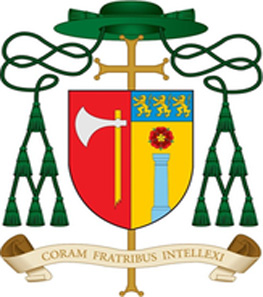His arms (rendered by the late Michael McCarthy) were slightly modified after he originally assumed them (second image). In addition, the artist chose to give his galero an extra row of tassels since he was Abbot-Primate of the Order but there is no precedent for such a decision. Abbot-Primate and Archabbots usually use a galero with twelve tassels as other Abbots do. The arms reflected his love of music as well as his own Benedictine monastic life.