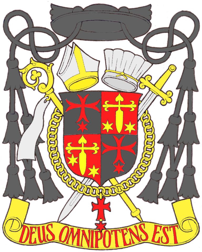 The shield is ensigned with the black pilgrim’s hat, called a galero, used in heraldry for clerics in place of the traditional helmet, mantling and crest. The hat has black cords terminating in twelve black tassels. Behind the shield and extending above and below it is a gold (yellow) abbot’s crozier with the sudarium (veil) attached. This veil was used in former times to protect the shaft of the crozier from dirt and perspiration before the time when abbots would have worn liturgical gloves. While the veil is no longer used it remains as a heraldic emblem to distinguish the crozier of an abbot. These are the ornaments proper to a prelate with the rank of abbot according to the Instruction of the Holy See, “Ut Sive” of March 1969.