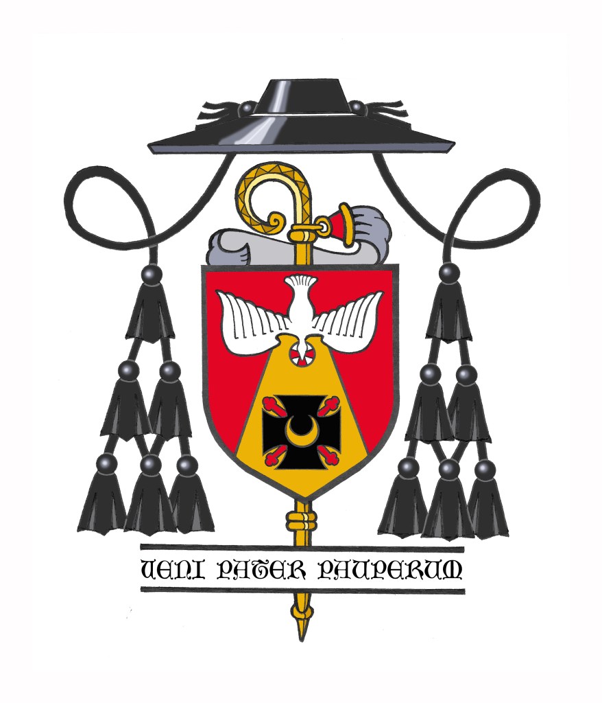 On a scroll below the shield we see Abbot Michael’s chosen motto, “Veni Pater Pauperum” which is from the Pentecost Sequence, “Veni, Sancte Spiritus”.