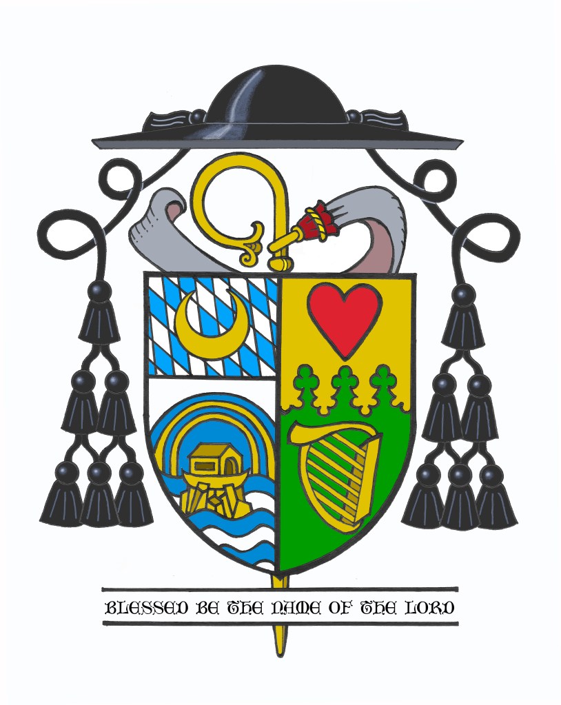 The personal armorial bearings which Abbot Augustine has assumed recall his Irish heritage, his patron saint and his Benedictine life. The green field with a gold (yellow) harp is a symbol of his Irish ethnic background as well as an allusion to the singing of the psalms, composed by King David, which are traditionally accompanied on the harp. This is the principal work of a Benedictine monk —the ora in “Ora et Labora”— as it were. The upper portion of the shield is divided using a line representing trefoils, more commonly known as shamrocks, a further symbol of Ireland and, in particular, the Irish rebels Abbot Augustine counts among his ancestors. Those facing upward are three in number as an oblique reference to the fact that Abbot Augustine is the third Abbot of Newark Abbey. On the upper portion of the shield is a single red heart. The heart is used as a symbol of St. Augustine, the abbot’s monastic patron saint but also represents the exhortation to “Listen…inclining the ear of one’s heart” that makes up part of the Prologue of the Holy Rule of St. Benedict.