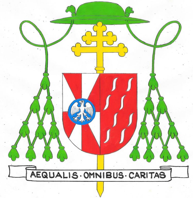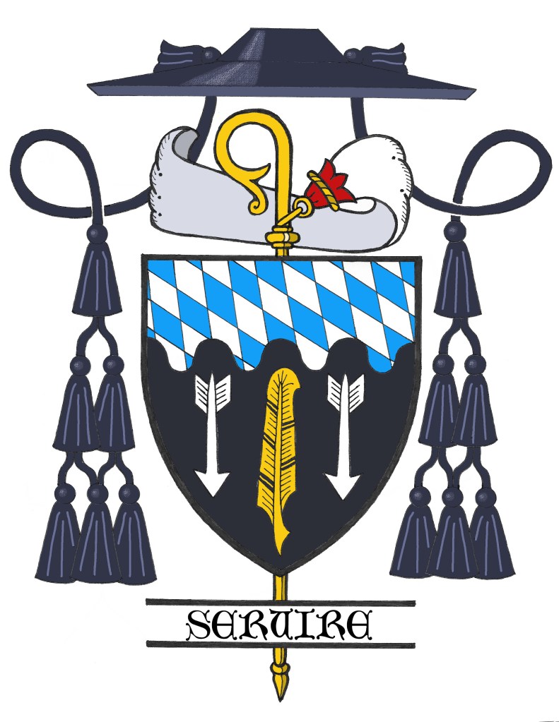 The blazon is: “Sable, a quill pen, point downward Or between two arrows, points downward Argent; a chief wavy, fusily in bend Azure and Argent. Shield ensigned with an abbot’s crozier Or behind the shield with the sudarium attached and an abbot’s galero Sable cords and twelve tassels disposed in three rows of one, two and three all Sable. On a scroll below the shield the motto: “Servire”.”