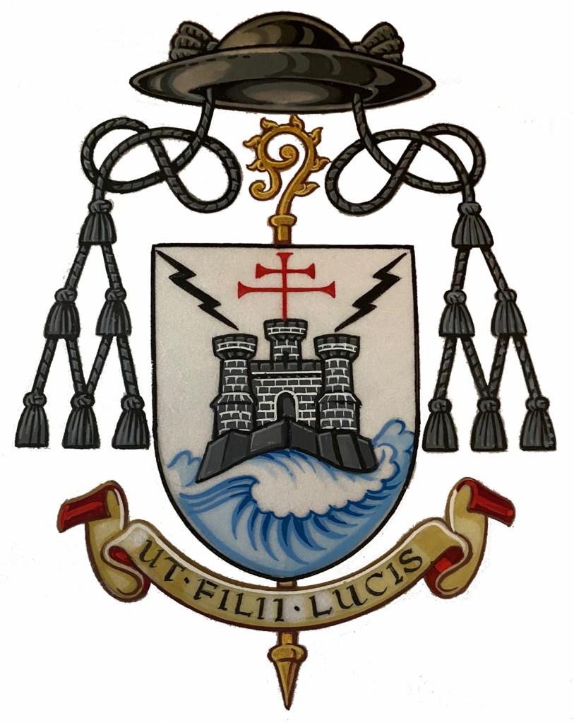 A helpful reader directed me to the following information: The lions are taken from the arms of Mt. St. Bernard Abbey, Bishop Erik’s monastery. The pillar comes from the motto that he had used as abbot (“Columna in templo Dei”) – “A pillar in the temple of God”, a quote from the Book of Revelation. The rose symbolizes the flower that sprang from Root of Jesse, a reference to the mystery of the incarnation. The coat of arms was designed by Archbishop Charles Scicluna.