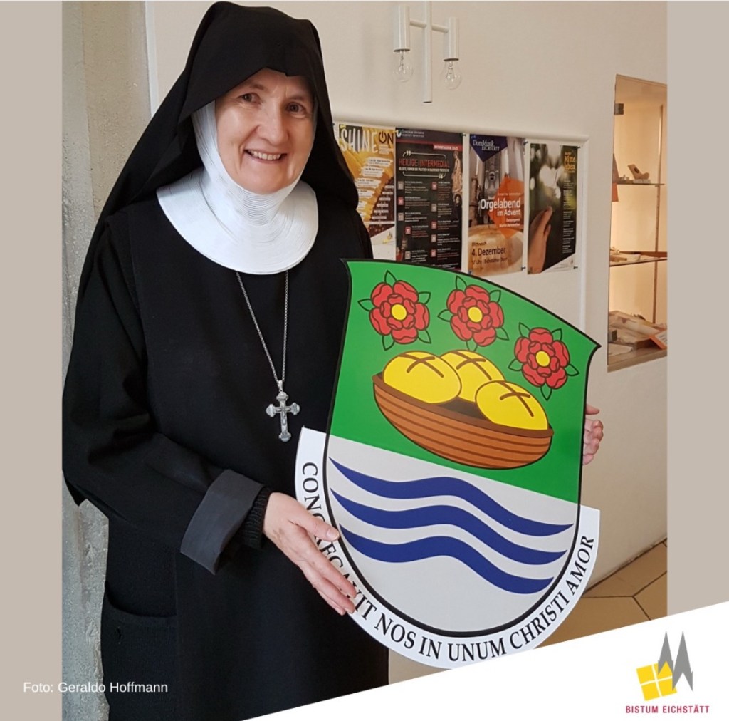 Her assumed coat of arms depicts, in chief, the bread and roses that are symbols of her patroness, St. Elizabeth of Thuringia. In base the three wavy lines represent rivers from three places of importance in her life: the Elbe in Torgau where she grew up; the Saale in Jena where she studied; the Altmühl in Eichstätt where she became a nun. The motto says “We are bound together by the love of Christ”.
