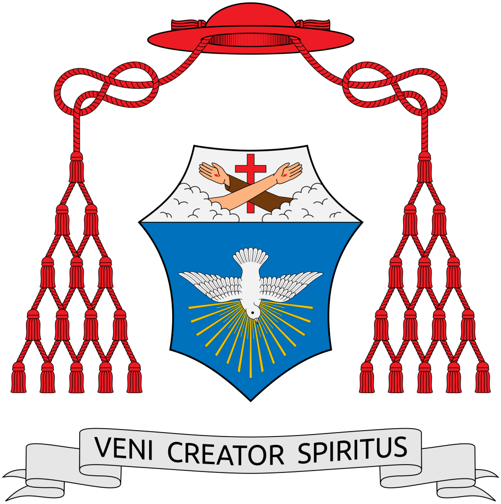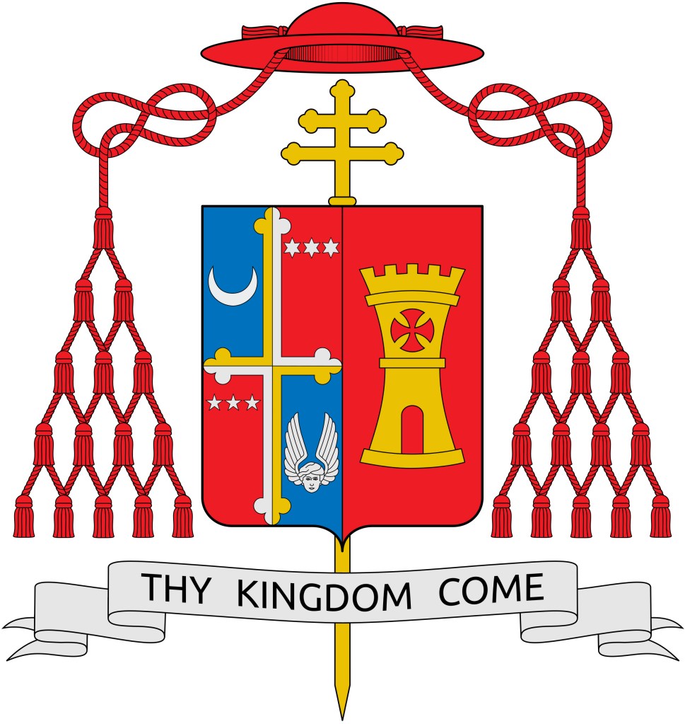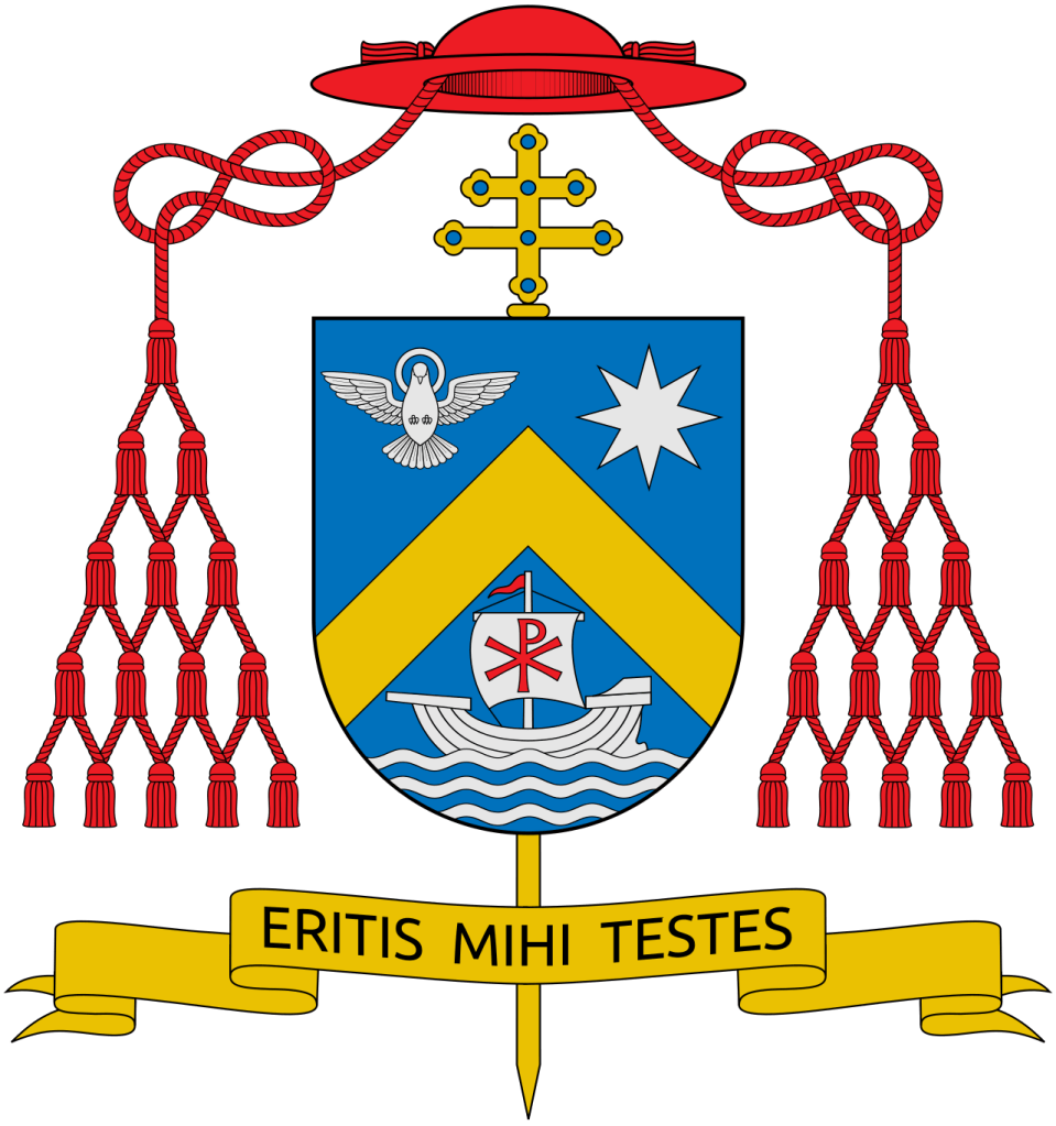 The shield is ensigned with an archiepiscopal cross Or in pale behind the shield and surmounted by a cardinal’s galero with cords and fifteen tassels on either side in five rows of one, two, three, four and five all Gules.