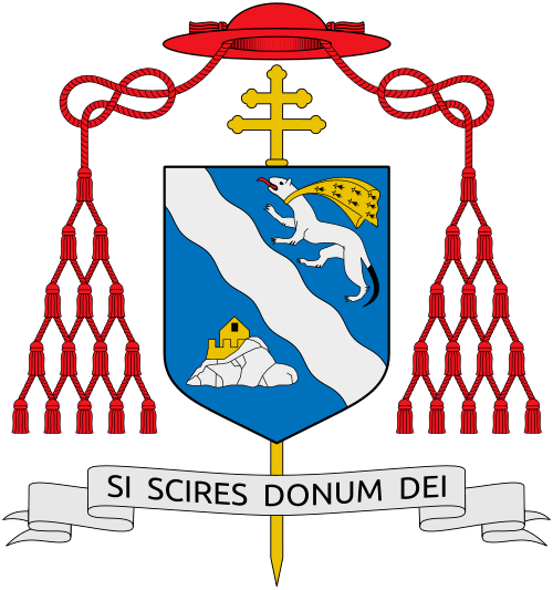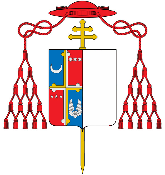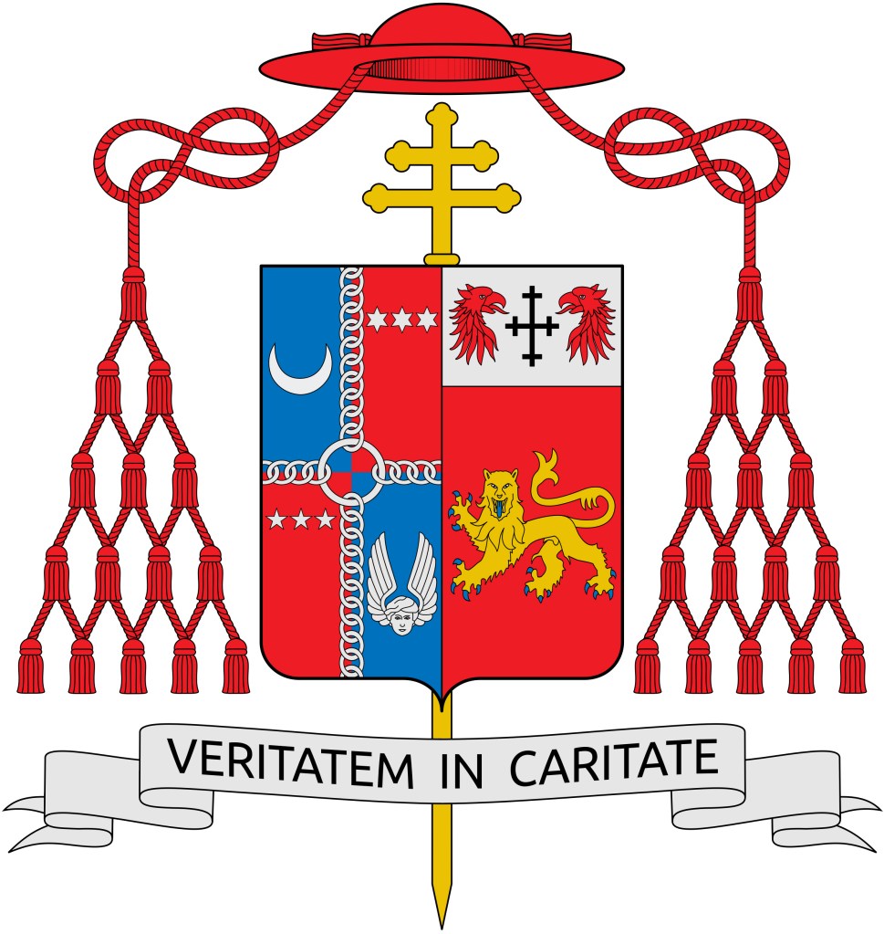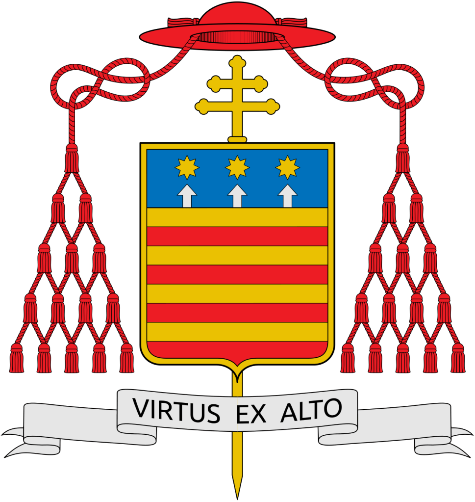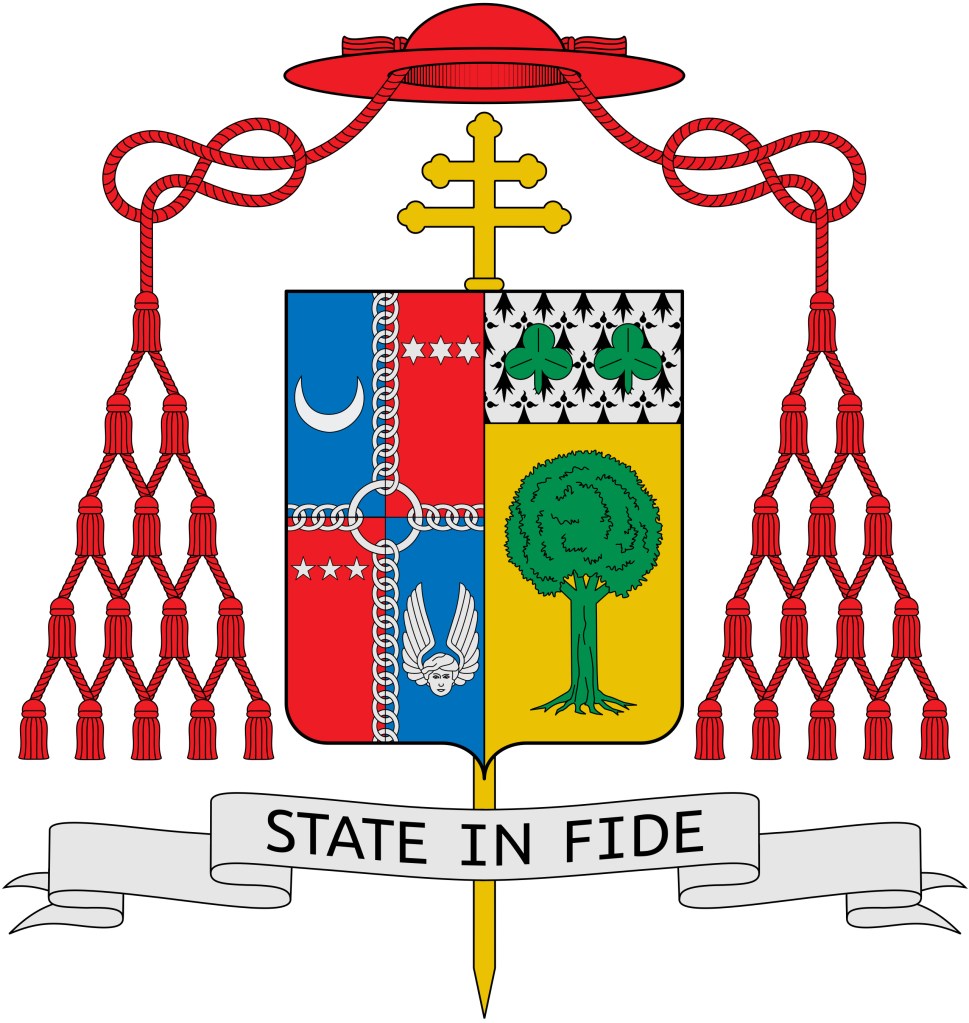 The shield is ensigned with an archiepiscopal cross Or in pale behind the shield and surmounted by a cardinal’s galero with cords and fifteen tassels on either side in five rows of one, two, three, four and five all Gules.