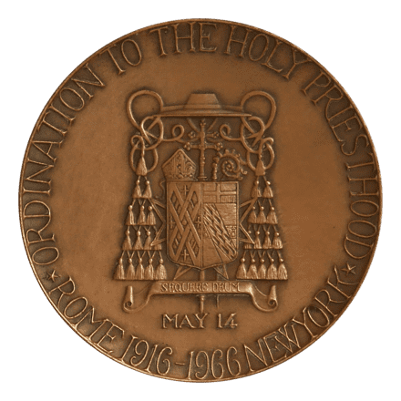 In 1966 Francis Cardinal Spellman, Archbishop of New York celebrated the golden jubilee of his ordination to the priesthood. A special commemorative medal was struck to mark the occasion. The obverse depicted a portrait in profile of the cardinal. The reverse (pictured) depicted his very nicely designed coat of arms. These arms are actually not those he assumed upon becoming a bishop. When he moved to New York he adopted an entirely different coat of arms which he used for the rest of his life. Those are on the medal.