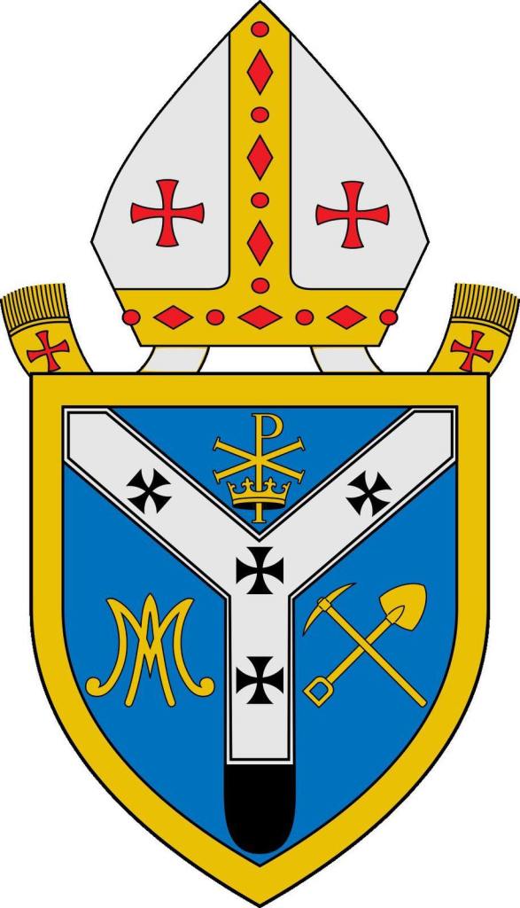 The blazon of the arms is: “Azure, within a bordure Or, a pall Proper between, in chief, the letters Chi and Rho enfiling an open crown, to dexter, the monogram of Our Lady and to sinister a pick-axe and shovel in saltire, all Or; all within a bordure Or.”