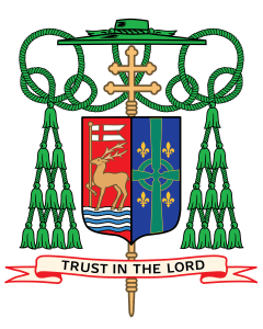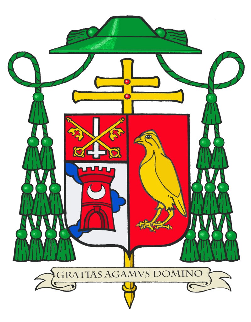 BLAZON: Arms impaled. In the dexter: Argent, a chevron invected issuant from the dexter, overall a tower embattled Gules charged with a crescent Argent; on a chief Gules a Latin cross reversed Argent surmounted by two keys in saltire Or. In the sinister: Gules a quail statant Or. The shield is ensigned with an archiepiscopal cross Or and an archbishop’s galero with cords and twenty tassels flanking the shield disposed in four rows of one, two, three and four all Vert. On a scroll below the shield is the motto, “Gratias Agamus Domino”.
