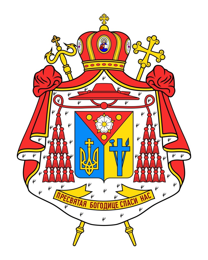 The blazon is: Tierced in pall; in chief, Gules a rose Argent, barbed and seeded Or between three bezants; in dexter base Azure a trident (tryzub) topped with a Greek cross, all Or; in sinister base Or a Latin cross on a perch of a staff topped by a sponge in bend and a spear in sinister bend all Azure. The shield is ensigned with the galero of a cardinal of the holy Roman Church with cords and 30 tassels disposed in five rows of one, two, three, four and five all Gules; the whole within a mantle Gules lined ermine surmounted by the Eastern mitra Gules; in saltire behind the mantle a crozier and a cross both Or.