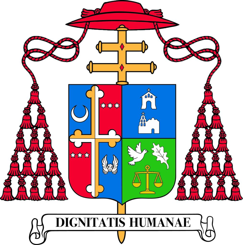 On a scroll below the shield is the motto: “Dignitatis Humanae.”