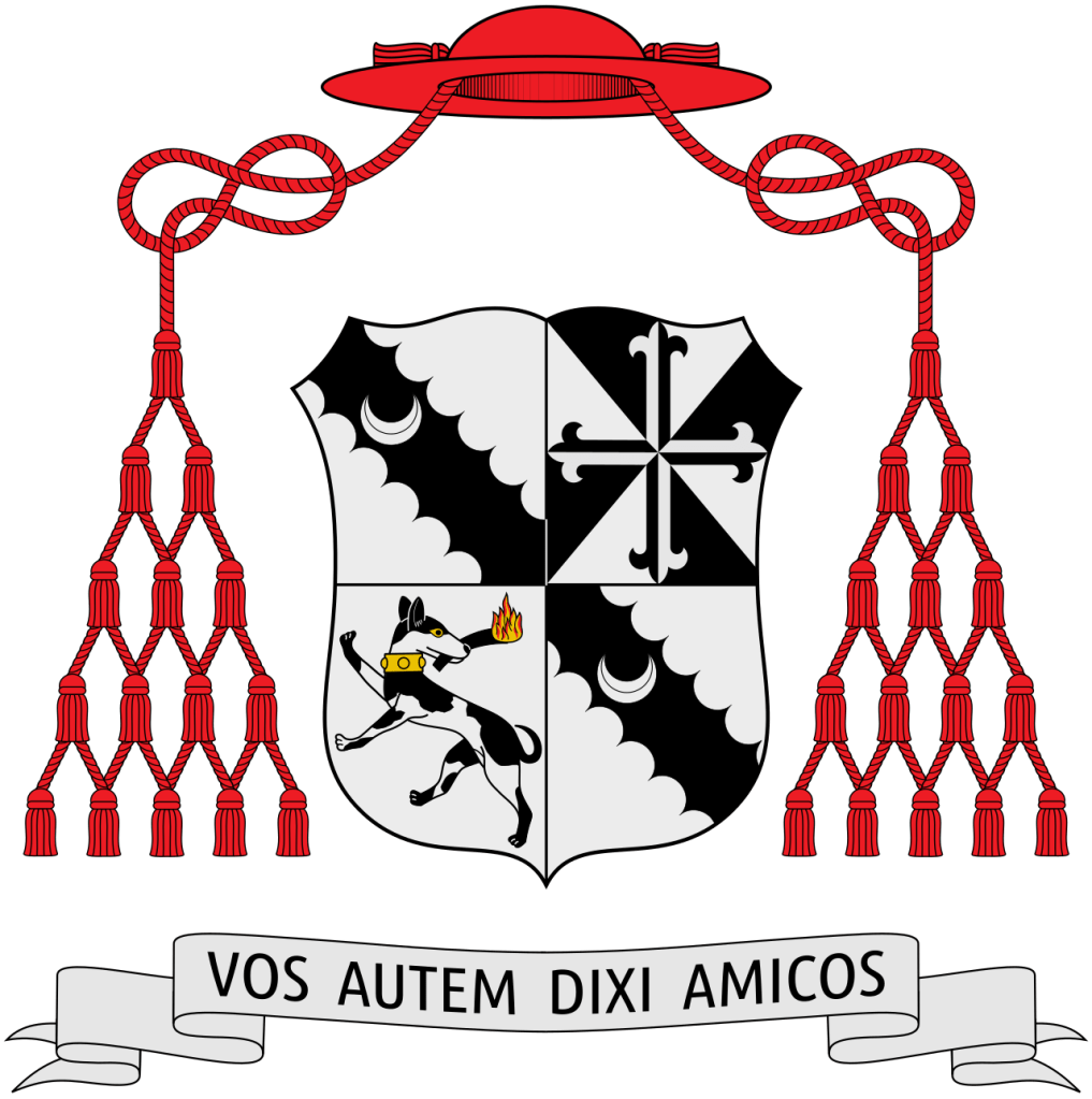 The shield is ensigned with an archiepiscopal cross Or in pale behind the shield and surmounted by a cardinal’s galero with cords and fifteen tassels on either side in five rows of one, two, three, four and five all Gules.