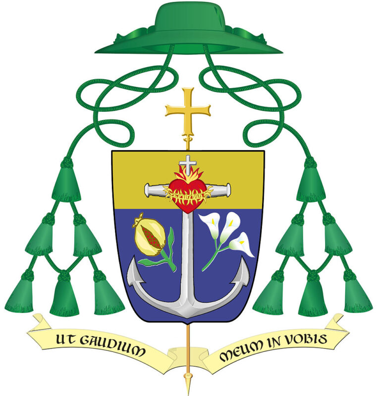 In the latest rendering the overcrowded and poorly composed original coat of arms now falls victim to, perhaps, my second favorite pet peeve: they were changed in order to combine well with the diocesan arms. That’s not an option, full stop. (I suppose Sister didn’t find anything in her research that said she couldn’t do that either!) In addition, the charges form the personal arms are still going beyond the divisions and boundaries of the shield and/or spilling over from one impalement to the other. Clearly, this is also the classic mistake of thinking that the diocesan arms now somehow “become” part of the bishop’s coat of arms rather than being an example of two distinct and separate coats of arms marshaled together on one shield so as to express the relationship between the two!