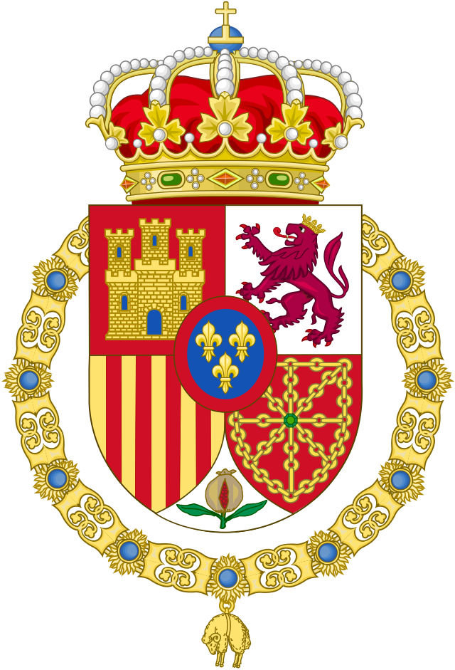 The coat of arms that will be used by King Felipe VI after his proclamation as king on June 19. The lion of Leon is correctly depicted as Purpure rather than Gules. In addition, the yoke and arrows used by Juan Carlos I as well as the Burgundian saltire behind the shield will not be used by Felipe VI.